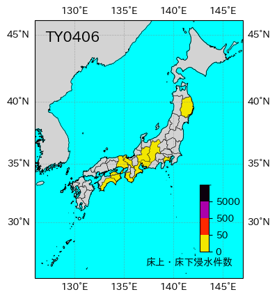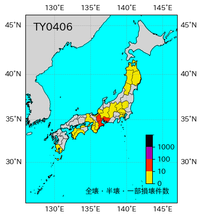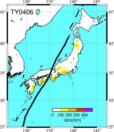気象の状況6月13日にカロリン諸島近海で発生し、16日には大型で非常に強い勢力に発達した。20日には沖縄・奄美諸島近海を通り、21日に強い勢力のまま高知県室戸市付近に上陸した。兵庫県明石市付近に再上陸し、京都府舞鶴市付近を通って日本海へ進み、能登半島の沿岸、佐渡沖を通って、津軽海峡の西で温帯低気圧に変わった。20日から21日には、沖縄地方から東北地方にかけて台風接近・通過時を中心に暴風となり、高知県室戸岬で最大風速43.7ms(最大瞬間風速57.1ms)、沖縄県南大東島で最大風速28.6ms(最大瞬間風速48.7ms)などを観測した。また、18日から22日にかけての総降水量は、三重県、高知県、徳島県で400mmを超え、九州地方から東海地方にかけての太平洋側で300mmを超えた所があった。死者・行方不明5人、負傷者117人、全壊1棟、半壊5棟、一部損壊168棟、床上浸水4棟、床下浸水45棟(情報元:消防庁)。 |