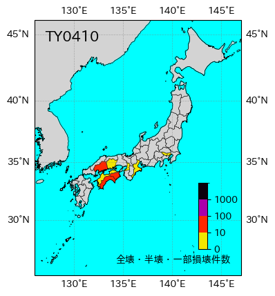 | 都道府県 | 死者・不明者 | 負傷者 | 全壊 | 半壊 | 一部破損 | 床上浸水 | 床下浸水 | 非住家 | 情報元 |