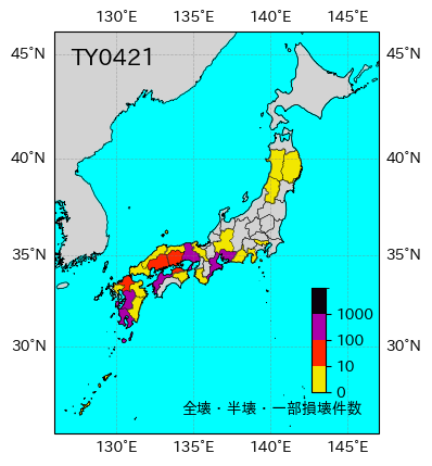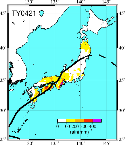 気象の状況9月21日にグアム島の西南西海上で発生し、発達しながら北西に進み、24日には中心気圧940hPa、最大風速45m/s、暴風半径170km、強風半径370kmの非常に強い勢力となった。勢力を維持しながら沖縄本島と宮古島の間を通過し、29日に中心気圧970hPa、最大風速30m/s、暴風半径100km、強風半径260kmの勢力で鹿児島県串木野市付近に上陸した。高知県宿毛市付近に再上陸後、高知県、徳島県を横断。さらに大阪市付近に再上陸した。台風は各地に大雨をもたらし、崖崩れ、土石流、土砂崩れなどが発生。また河川の増水などによる浸水害が三重県、愛媛県、兵庫県を中心に発生。さらに、27日は沖縄県名護市付近や今帰仁村付近で、29日には愛知県豊橋市付近で竜巻が発生。29日07時50分までの1時間に三重県尾鷲市で133mm、09時40分までの1時間に同宮川村で139mmの猛烈な雨を観測するなど、台風と前線の影響による総雨量は尾鷲市で900mmを超えるなど、西日本から東海地方にかけて大雨をもたらした。翌日30日には東北地方で大雨となった。死者・行方不明27人、負傷者98人、全壊92棟、半壊783棟、一部損壊2007棟、床上浸水5193棟、床下浸水14412棟(情報元:消防庁)。 |