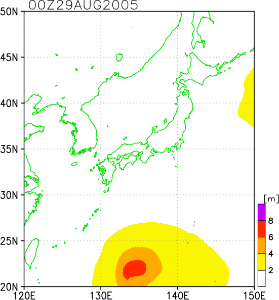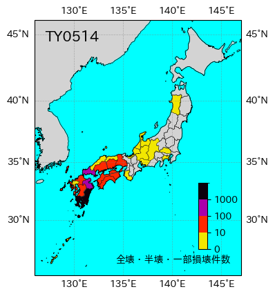 気象の状況8月29日に発生し、5日には名瀬市の東南東約110kmの位置に達した。その後九州南部の西海上を北上し、6日に長崎県諫早市に上陸した。九州北部を通過した後、山陰沖に抜け、日本海を北東に進んだ。7日には北海道瀬棚町に上陸し、北海道北部を通過、オホーツク海上で温帯低気圧に変わった。この台風はゆっくりと九州西方海域を進んだため、九州各地では大雨となり、宮崎県・大分県を中心とする九州地方では土砂崩れや河川の氾濫などの災害が発生した。死者・行方不明29人、負傷者179人、全壊1178棟、半壊3692棟、一部破損2817棟、床上浸水7159棟、床下浸水13580棟(情報元:消防庁)。 |