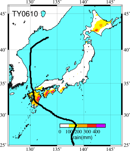 気象の状況8月13日に小笠原諸島の西南沖で発生し、ゆっくりとした速度で北西に進み、18日に宮崎市付近に上陸した。ゆっくりとした速度で九州を北上し、19日に北九州沖から日本海に抜け、20日には熱帯低気圧に変わった。風速25m以上の暴風域は無いが、速度が遅く九州、四国にかけて長時間の大雨となった。また日本海側の前線の影響で北海道、東北北部でも大雨となった。 |