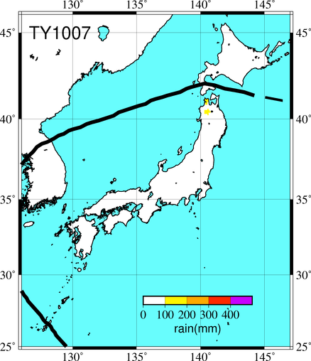 気象の状況8月29日に沖縄の南東海上で台風となり、発達しながら北西に進み、31日に沖縄本島北部を通過した。1日には九州西方の東シナ海を北北西に進み、2日に朝鮮半島に上陸・横断した後、日本海を北東に進み、3日に日本海で熱帯低気圧になった。 |