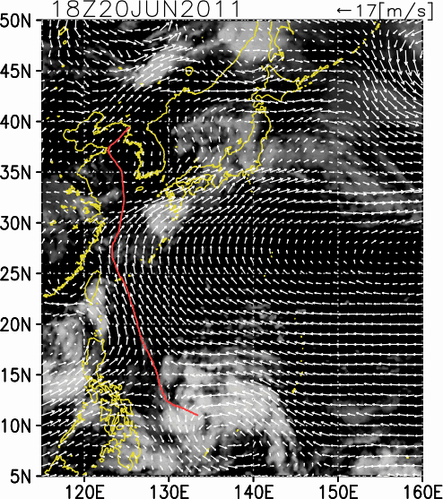 気象の状況6月22日にフィリピンの東海上で発生し、25日に沖縄・先島地方を通過、26日から27日にかけて黄海を北上し温帯低気圧となった。 |