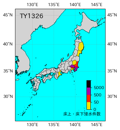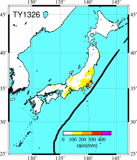 気象の状況10月11日にマリアナ諸島近海で発生し、14日には非常に強い台風となった。15日には強い台風となり、日本の南海上を北東に進み、16日には伊豆諸島、三宅島の東海上を進んだ後、房総半島沖から東北沖を北東に進み、三陸沖で温帯低気圧に変わった。東京都大島町では24時間降水量が800ミリを超える大雨となった。死者・行方不明者43人、負傷者130人、全壊86棟、半壊61棟、一部破損947棟、床上浸水1884棟、床下浸水4258棟(情報元:消防庁)。 |