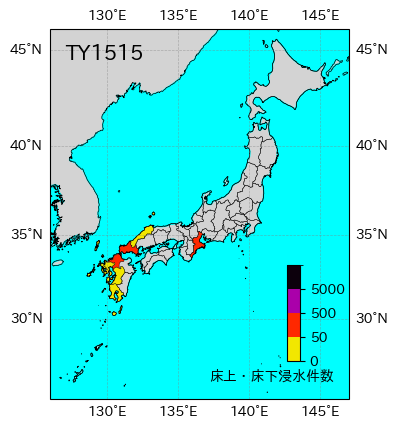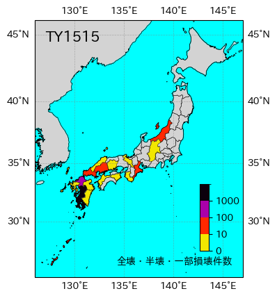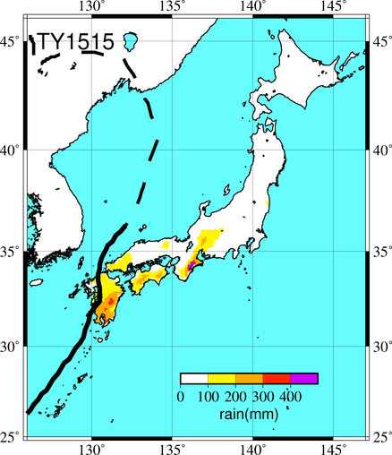 気象の状況8月15日にマリアナ諸島近海で発生し、17日には中心気圧935hPa、中心付近の最大風速50m/sの非常に強い勢力となった。24日には久米島の北北西約60kmの海上まで接近し、その後も非常に強い勢力を維持したまま速い速度で北東へ進んだ。25日に熊本県荒尾市付近に強い勢力で上陸した後、福岡県を通過して玄界灘を北に進み、日本海で温帯低気圧となった。石垣島で23日21時16分に71mの最大瞬間風速を観測する等、南西諸島や九州を中心に猛烈な風が吹き、海上は猛烈なしけとなった。台風や南から流れ込む暖かく湿った空気の影響で、三重県で25日一日の雨量が500mmを超える等、南西諸島や西日本、東海地方で大雨となった。死者1人、負傷者147人、全壊12棟、半壊138棟、一部損壊3555棟、床上浸水53棟、床下浸水344棟(情報元:消防庁)。 |