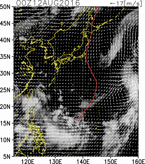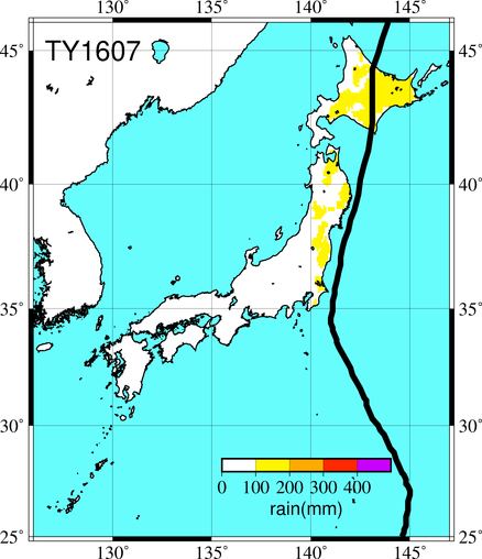 気象の状況8月14日にマリアナ諸島で発生し、16日には八丈島の南東海上に進んだ。千葉県銚子市の南約160キロ、茨城県水戸市の南東約80キロ、宮城県仙台市の南東約100キロと、関東の東海上から三陸沖を北に進んだ。その後、台風は速度を速めながら北に進み、北海道襟裳岬付近に上陸した後、温帯低気圧に変わった。この台風により関東地方では、16日午後から17日午前中にかけて、大雨や強風となった所があり、茨城県や千葉県で浸水害や道路冠水、 鉄道の運休などの交通障害があった。また、茨城県では日最大1時間降水量で統計開始以来1位の値を観測した地点があった。 |