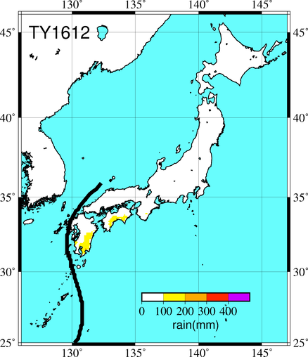 気象の状況9月1日に沖縄の南海上で発生し、南大東島の南海上で強い台風となり、 3日には奄美大島の東約100kmの海上で中心気圧955hPa、中心付近の最大風速40m/sまで発達した。 強い勢力のまま4日に枕崎市の南西約60kmの海上まで北上した後、勢力を弱めながらゆっくりと北上を続け、長崎市付近に上陸し、対馬海峡で熱帯低気圧となった。強い台風第12号の接近により、鹿児島県の中之島では、9月3日14 時09分に最大瞬間風速47.6m/sを観測した。2日から5日にかけて、熊本県、宮崎県、鹿児島県では総降水量200mmを超える大雨となった。この期間、中之島で349.0mm、志布志で271.0mm、宮崎県の野尻で218.5mm、熊本県の湯前横谷で221.5mmの降水量を観測した。また、台風が接近した9月3日14時38分に中之島で、観測史上1位となる1時間に129.5mmの猛烈な雨を観測した。 |