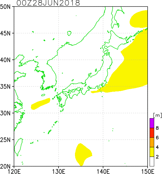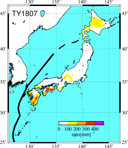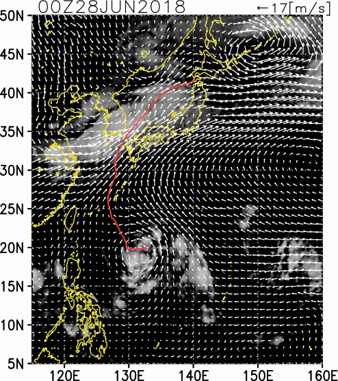 気象の状況6月29日に日本の南で発生し、ゆっくりとした速度で西へ進んだ後、沖縄の南で発達しながら北よりに向きを変え、北上を続けた。2日には久米島にかなり接近し、九州の西海上を北上後、4日には対馬海峡を抜けて日本海を北東に進んだ。 |