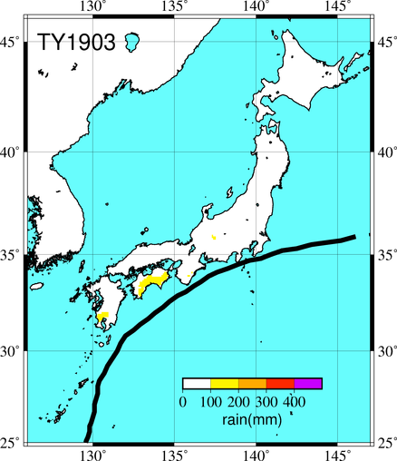 気象の状況熱帯低気圧と前線の影響により、沖縄・奄美では6月27日朝にかけて、西日本太平洋側では27日朝から非常に激しい雨となった。27日18時に熱帯低気圧から変わった台風第3号は、温帯低気圧の性質を帯びながら、西日本から東日本の太平洋沿岸を東北東に進み、28日には日本の東で温帯低気圧へ変わった。一部破損3棟、床下浸水2棟(情報元:消防庁)。 |