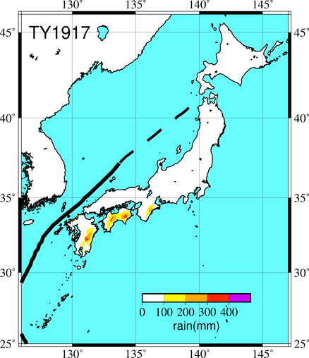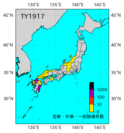 気象の状況9月19日に発生した台風第17号は、勢力を増しながら北上し、21日に沖縄本島に最も接近し、暴風域を伴って22日には九州北部地方、23日朝には中国地方に接近した。沖縄地方では21日から22日にかけて、西日本の太平洋側では22日から23日にかけて非常に強い風が吹き、局地的に大雨となった。23日に日本海で温帯低気圧に変わったが、最大風速23メートルの勢力となって北日本へ進み、北海道地方では非常に強い風が吹いた。死者・行方不明者2人、負傷者69人、半壊9棟、一部破損719棟、床上浸水97棟、床下浸水147棟(情報元:消防庁)。 |