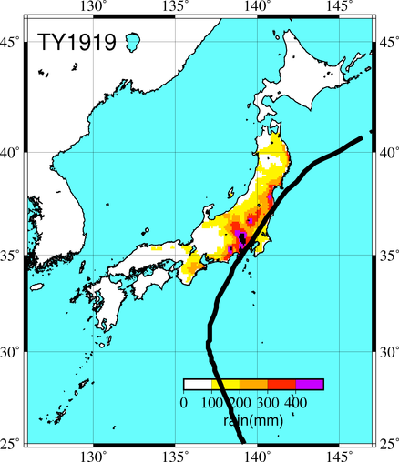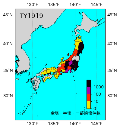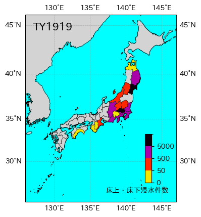 気象の状況10月6日に発生した台風第19号は、非常に強い勢力を保ったまま、12日19時前に伊豆半島に上陸し、13日に北海道の南東海上で温帯低気圧に変わった。西日本から東日本の太平洋側を中心に広い範囲で激しい雨が降り、12日15時30分に群馬県、埼玉県、東京都、神奈川県、山梨県、長野県、静岡県に、同日19時50分、宮城県、福島県、茨城県、栃木県、新潟県に、13日には岩手県に大雨特別警報が発表された。死者・行方不明者86人、負傷者375人、全壊3203棟、半壊27154棟、一部破損29985棟、床上浸水7316棟、床下浸水21069棟(情報元:消防庁)。 |