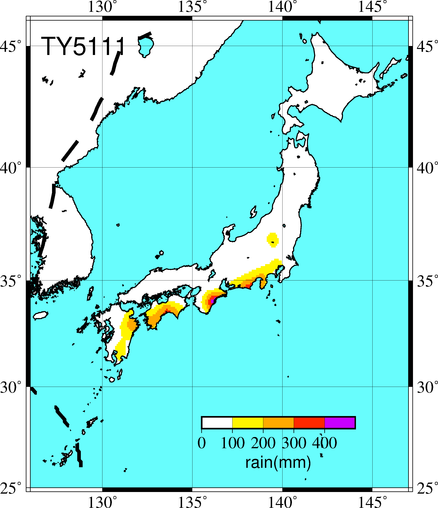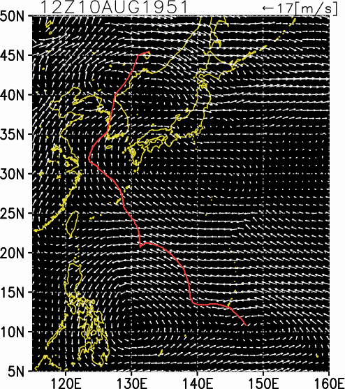 気象の状況8月10日21時グアム島の南東海上に発生した熱帯低気圧は,北西に進行した。11日7時52分の飛行機観測により台風(Tropical Storm)として取り扱われるようになり,Margeと命名された。11日21時には台風(Typhoon)となった。台風は西進し,13日午前にはグワラ島はるか西方に達し北ないし北西に転向した。18日9時には沖縄近海に達して東シナ海を北西進した。21日夜には上海沖において北東に転向し,23日9時頃朝鮮半島南西端を通過し,24日9時にはウラジオ付近に達した。死者・行方不明4人、負傷者11人、全壊23棟、半壊40棟、流失1棟、一部破損2棟、床上浸水37棟、床下浸水585棟(気象要覧第624号) |