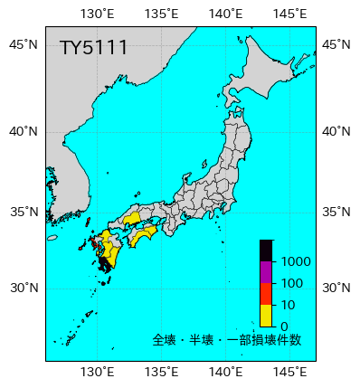 | 都道府県 | 死者・不明者 | 負傷者 | 全壊 | 半壊 | 一部破損 | 床上浸水 | 床下浸水 | 非住家 | 情報元 |