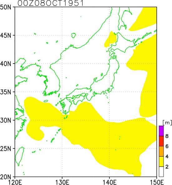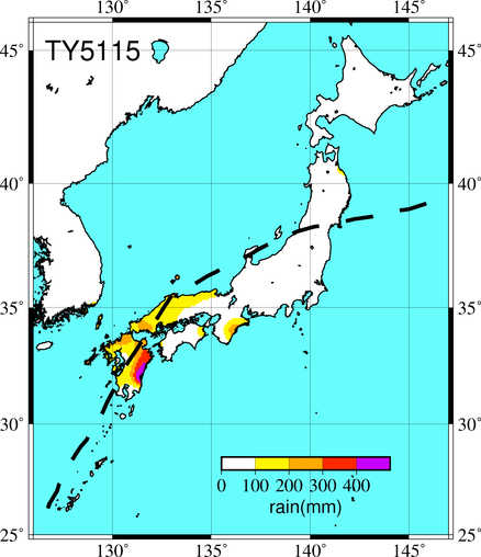 気象の状況10月8日朝に認められた熱帯低気圧は,9日9時には台風(Tropical Storm)となり,Ruthと命名された。21時には台風(Typhoon)として扱われることになった。台風は北西ないし西北西に進んだ。12日15時頃から次第に北上し,13日夜半から14日にかけて宮古島と沖縄との間を通って東シナ海に入り,その後北東進した。14日19時頃鹿児島県串木野付近に上陸,14日21時には熊本と阿蘇山の中間付近に達した模様であるが,このころから中心が2つに分裂した。22時には日田市の南東に達し,22時過ぎには国東半島付近を通って周防灘にでた。台風は防府市訃音に上陸し,浜田の西より日本海に出て,西郷の西側を15日4時頃通過した。 分裂した東側の台風中心は徳山市東方から中国地方に上陸し,広島の北を通って,米子の東から日本海に出た。10月9日8時57分の中心示度は992.9hPaであった。11日15時には948hPaであったが,12日15時には925hPaとなり,1日で23hPa低下した。このころの中心付近の最大風速は60m/s,中心から400km以内の海上で風速25m/sを越えていた。 死者・行方不明943人、負傷者2644人、全壊21527棟、半壊47948棟、流失3178棟、一部破損148454棟、焼失11棟、床上浸水30110棟、床下浸水108163棟(気象要覧第626号) |