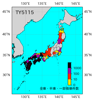 | 都道府県 | 死者・不明者 | 負傷者 | 全壊 | 半壊 | 一部破損 | 床上浸水 | 床下浸水 | 非住家 | 情報元 |