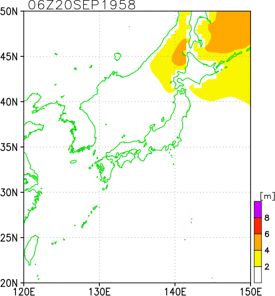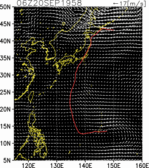 気象の状況9月20日15時、グアム島東で熱帯低気圧が発生し、21日3時台風となった。西進を続け、22日夜半頃より進路を北西に変え、さらに北東に変え、26日21時頃長津呂付近、27日0時頃三浦半島、1時に東京を通過した。台風は27日9時には金華山沖にぬけて温帯低気圧になった。温帯低気圧は北上し、北海道南端を通り28日午後には根室付近を経て北海道東方洋上に抜けた。24日13時30分には、中心気圧877hPa、最大風速75m/s以上を観測した。上陸時の中心気圧は960hPa〜965hPa、最大風速は50m/sとなっていた。 死者・行方不明1269人、負傷者1138人、全壊1289棟、半壊2175棟、流失829棟、半焼2棟、一部破損12448棟、床上浸水132227棟、床下浸水389488棟(気象要覧第709号) |