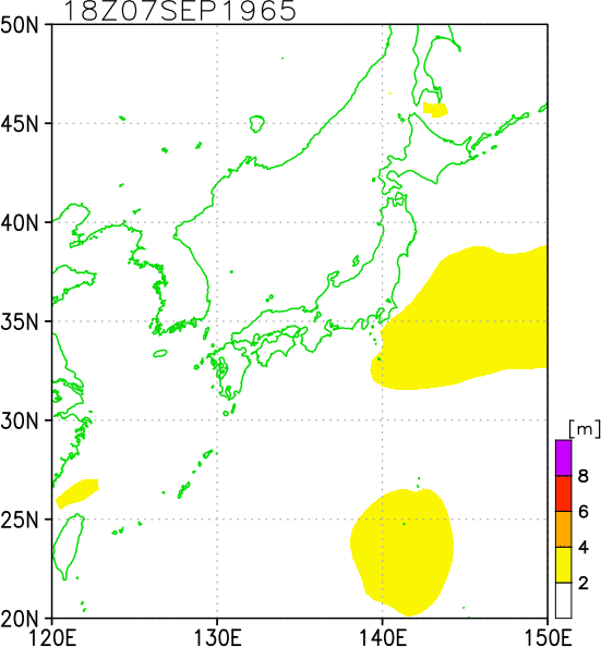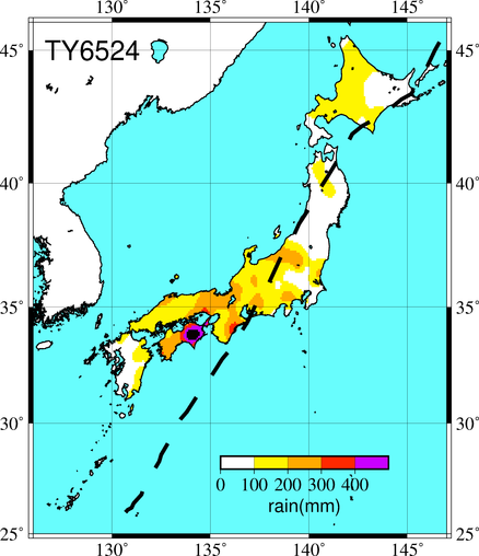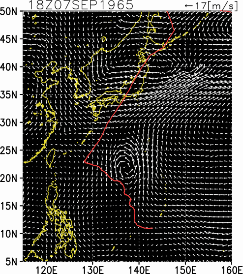 気象の状況9月8日3時グアム島の南西300kmの海上に発生した熱帯低気圧は,発達しながら北北西進し,11日9時には沖ノ鳥島の南西およそ400kmの海上に達して台風となった。その後も台風は発達を続けながら北北西から北西の間の方向に進み,15日には台湾の東約700kmの海上に達して停滞気味となった。台風は15日午後から進路を北東に向け,17日21時に三重県大王崎付近に上陸した。 同日21時過ぎに愛知県渥美半島に上陸し,23時には衰えて分裂を始めた。このときの本体は長野県飯田市にあったが,別に副低気圧が長野市の東方30kmと浜松市の北方20kmの地点に発生した。18日2時には,本体は急速に衰弱し,北側にあった副低気圧に勢力が移り初め,18日3時には山形県酒田市の南南西70kmに達した。18日5時には再び分裂し,秋田の南西45kmに達して北から北北東の間の方向に進み,同日7時頃津軽海峡の東方洋上で台風の中心は1つにまとまった。同日11時には浦河付近を北東進し,15時には知床半島に達して温帯低気圧となった。9月15日15時の飛行機観測によれば,中心気圧932hPa,中心付近の最大風速55m/s,風速25m/s以上の暴風半径300km。大王崎付近上陸時,中心気圧955hPa,最大風速50m/s,25m/s以上の暴風半径は,南東側350km,北西側100km。 死者・行方不明107人、負傷者330人、全壊409棟、半壊662棟、流失258棟、一部破損6776棟、床上浸水43082棟、床下浸水208738棟(気象要覧第793号) |