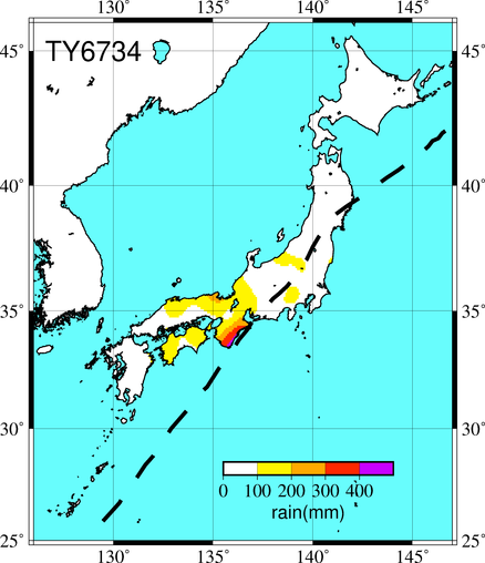 気象の状況10月16日9時,カロリン諸島の北緯8.5度,東経148.5度に発生した熱帯低気圧は,はじめ北北東進,後西進して,17日15時グアム島の南東280kmの海上,北緯12.3度,東経147.0度に達して台風となった。台風はその後も西南西進のち北西進した。26日早朝に進路を北東に向けて,28日早朝には志摩半島をかすめ,渥美湾を通って,3時半すぎ愛知県南部に上陸した。台風は上陸後,まもなく分裂し,28日9時には佐渡付近(副低気圧),関東北部,及び関東東方海上(副低気圧)に中心を持つ温帯低気圧となった。これら分裂した低気圧は29日3時,根室の南東海上で一つにまとまって,千島列島の東側を北進して去った。23日早朝の中心気圧は950hPa,中心付近の最大風速45m/s,風速25m/s以上の暴風半径は250kmであった(最盛期)。 死者・行方不明47人、負傷者41人、全壊99棟、半壊279棟、全焼8棟、一部破損2573棟、床上浸水3152棟、床下浸水23690棟(気象要覧第818号) |