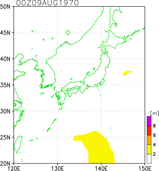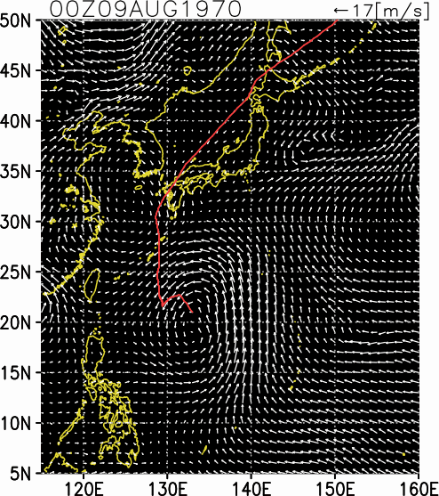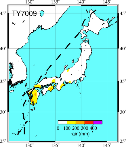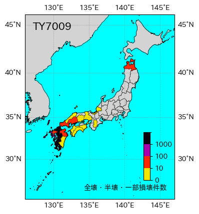 気象の状況8月9日9時,沖ノ鳥島の北西300kmの海上に発生した熱帯低気圧は,9日15時南大東島の南およそ350kmの海上で台風となり,発達を続けながら奄美群島の徳之島付近を通って14日23時頃長崎市付近に上陸,九州北部を斜断して山口県萩市から日本海に抜けた。その後,速度を速めて北東進し16日早朝渡島半島をかすめて北上し北海道北部を通ってオホーツク海に入った。死者・行方不明12人、負傷者326人、全壊959棟、半壊1827棟、一部破損13721棟、床上浸水697棟、床下浸水11209棟(気象要覧第852号) |