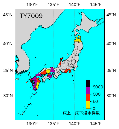 | 都道府県 | 死者・不明者 | 負傷者 | 全壊 | 半壊 | 一部破損 | 床上浸水 | 床下浸水 | 非住家 | 情報元 |