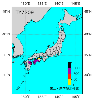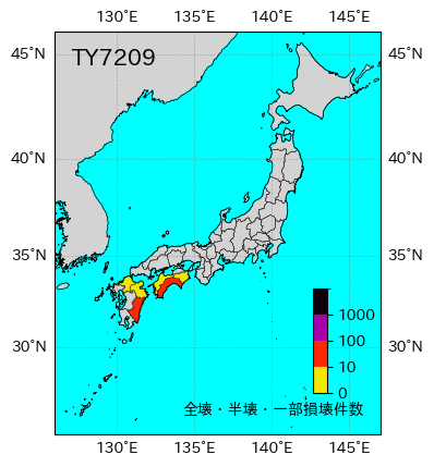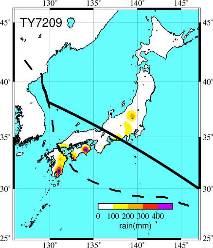 気象の状況北西進を続けて20日15時頃父島の東方海上に達した台風第9号は進路を西に変え,日本の南方海上を西北西進して23日20時頃宮崎県と大分県との県境付近に上陸した。上陸後北西進して21時頃大分市付近を,夜半頃には下関市付近を通り,日本海へ抜けた。死者・行方不明7人、負傷者7人、全壊16棟、半壊19棟、流失4棟、一部破損17棟、床上浸水326棟、床下浸水3276棟(気象要覧第875号) |