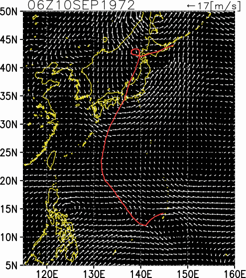 気象の状況台風は,16日朝に奄美大島の東約300kmに達して北北東に進み,同日18時30分頃潮岬付近に上陸した。上陸後三重・岐阜県を通って,17日早朝富山湾へ抜け,日本海を東北地方沿岸沿いに北上した。18日朝から留萌付近でまる1日がかりで左回りの円を描いた後19日朝に温帯低気圧となって東へと進み,21日千島方面に去った。死者・行方不明85人、負傷者157人、全壊229棟、半壊3984棟、浸水146547棟(気象要覧第877号) |
