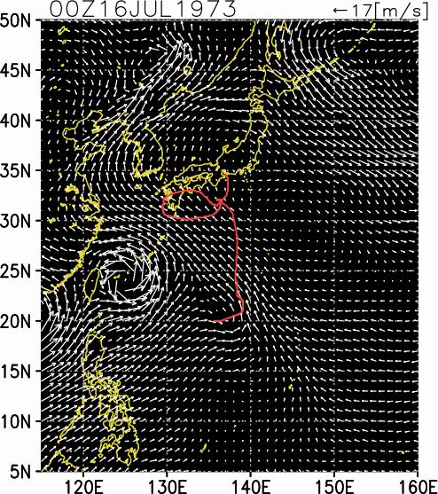 気象の状況7月21日紀伊半島沖で台風第6号は衰えて熱帯低気圧となり,四国沖から西進,24日9時には枕崎の南方海上100kmに達した。その後,熱帯低気圧は次第に向きを北に変え,天草西方海上で再び台風となって,25日午後熊本県宇土半島に上陸,進路を北東にとり,26日3時頃再び熱帯低気圧となり大分県南部から5時過ぎ四国沖に抜けた。死者30人、負傷者10人、全半壊110棟、浸水37783棟(気象要覧第887号) |