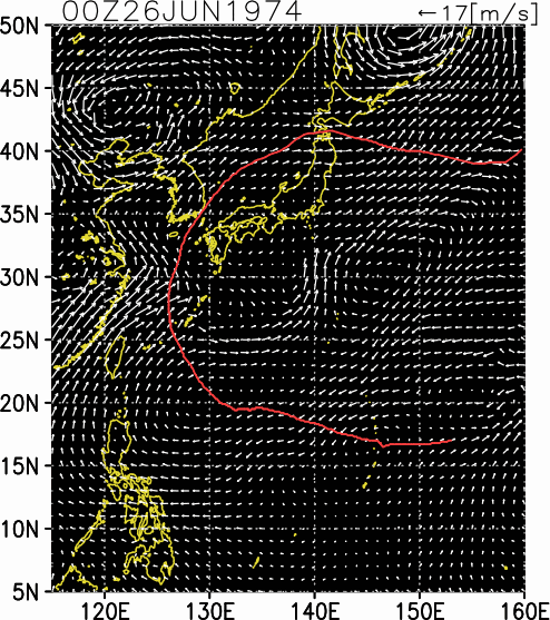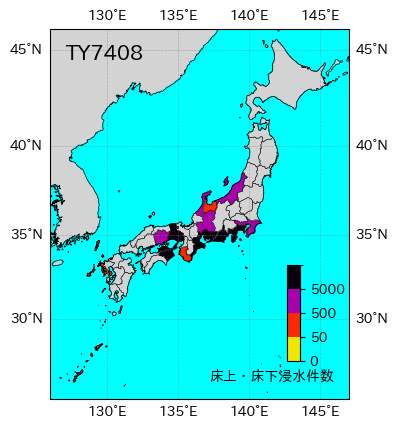 気象の状況7月1日3時に沖ノ鳥島付近の海上で発生した台風は次第に北上し,4日には沖縄西方海上で発達して西北西に進んだ。5日1時には久米島の西方を通過した。一方5日3時には梅雨前線が九州北部から本州太平洋沿岸に延びていた。台風は5日15時に奄美大島の西約330kmを経て,6日9時には鹿児島の西約330kmに達しさらに北上した。7日3時に台風は朝鮮海峡を通過した。その後台風は日本海中部を進み北海道南西部付近で温帯低気圧となった。死者111人、負傷者171人、全壊348棟、半壊1100棟、床上浸水31845棟、床下浸水104059棟(気象要覧第899号) |