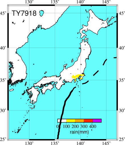 気象の状況10月4日に沖ノ鳥島付近で発生した台風は、6日には日本の南海上を北上した。これに伴って八丈島の南にあった前線も活発化して北上した。このため、関東から東海地方東部では6日夜半から激しい雨となり、7日には雨域は東北地方にも広がった。床上浸水27棟、床下浸水1226棟(気象要覧第962号)。 |