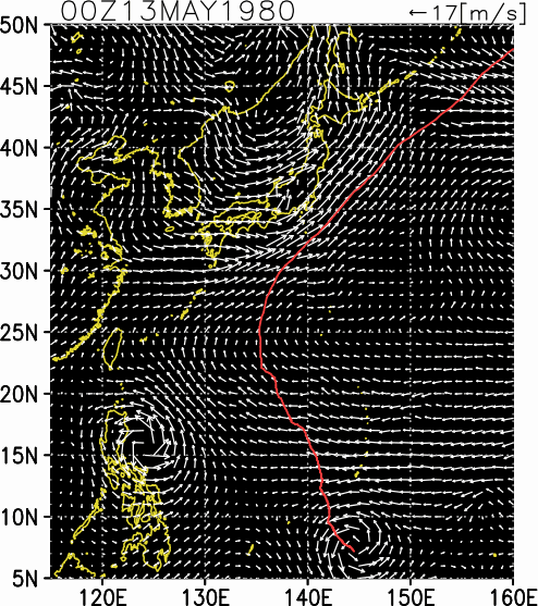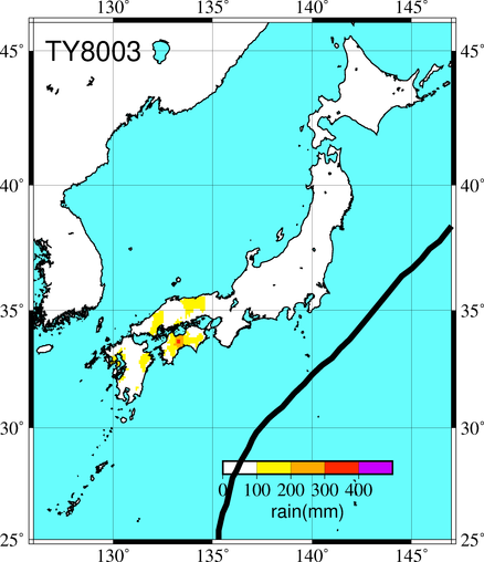 気象の状況日本の南海上を北上していた台風は、5月21日に向きを北東に変え、同日夜には房総半島の東約200kmの海上を通り、22日には北海道の東海上で温帯低気圧となった。この台風と21日頃日本付近にあった前線の影響で関東以西では強い雨が降り、関東太平洋沿岸や伊豆諸島で強風が吹いた。死者・行方不明1人、負傷者1人、半壊・一部破損7棟、床上浸水346棟、床下浸水724棟(気象要覧第969号)。 |