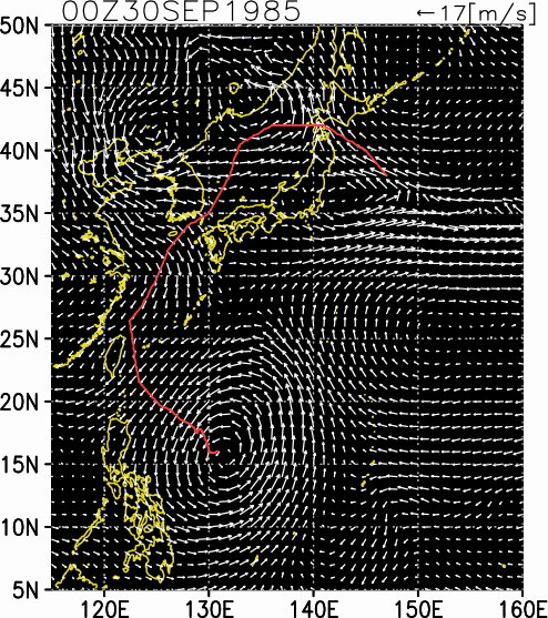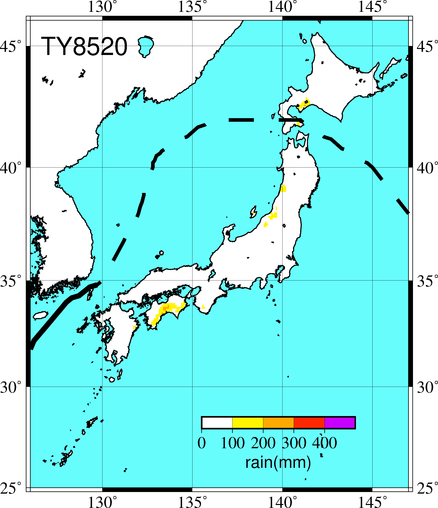 気象の状況10月4日に与那国島の西約20km付近を北上した後、進路を北東に変えて、朝鮮半島南岸で熱帯低気圧となり日本海を進んだ。負傷者35人、全壊・流失9棟、半壊・一部破損82棟、床上浸水82棟、床下浸水144棟(情報元:気象要覧第1034号)。 |