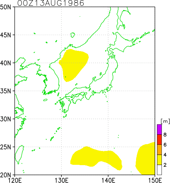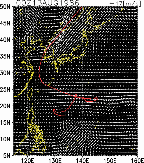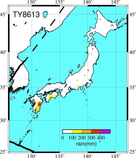気象の状況8月16日にフィリピンの東方海上で台風となり、小笠原諸島の遙か南の海上で迷走を続けた後西北西に進み、26日に沖縄本島を通過した。台風は東シナ海、朝鮮半島を通り、29日には日本海に入り温帯低気圧に変わった。死者1人、負傷者4人、全壊・流失22棟、半壊・一部破損294棟、床上浸水5棟、床下浸水16棟(情報元:気象要覧第1044号)。 |
