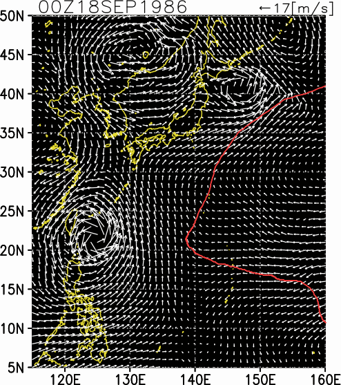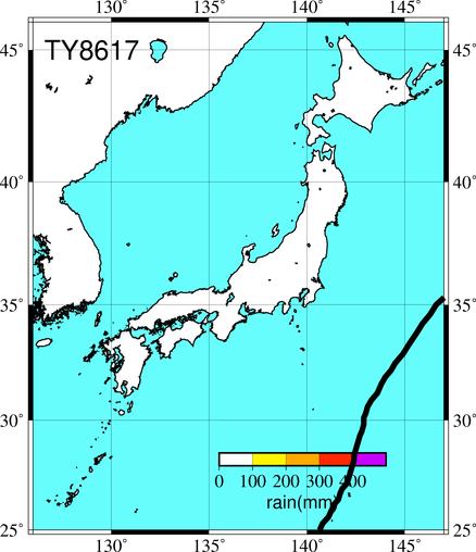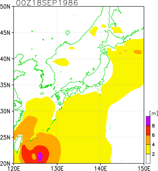 | 気象の状況9月19日にマーシャル諸島の西海上で台風となり、25日には小笠原諸島のはるか南方海上に達した。その後向きを北に変えて、28日夜父島を通過し、北北東へ進み、29日には八丈島の東海上を通り、30日に日本のはるか東海上で温帯低気圧に変わった。死者・行方不明4人、床上浸水13棟、床下浸水234棟(情報元:気象要覧第1045号)。 | 移動経路  | 有義波高  |