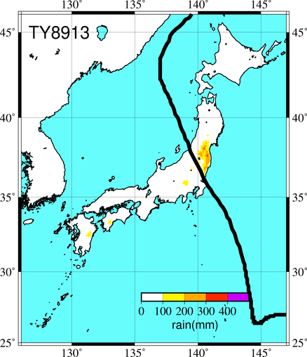 気象の状況7月30日に南鳥島の南海上で発生し、8月3〜4日にかけて父島の東方海上でほとんど停滞した。その後、伊豆諸島の東海上を北上して銚子市付近に上陸し、日本海へ抜けた。死者・行方不明15人、負傷者26人、全壊・流失13棟、半壊・一部破損146棟、床上浸水1688棟、床下浸水3375棟(情報元:気象要覧第1080号)。 |
