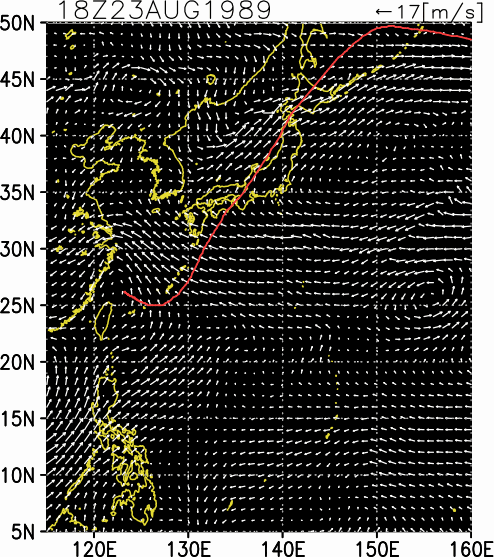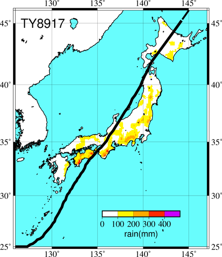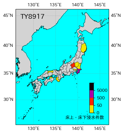 気象の状況8月24日に沖縄の西海上で発生し、27日に室戸市付近に上陸した後、四国、近畿、北陸、東北地方、北海道を通過したのち、オホーツク海に抜けた。死者6人、負傷者13人、全壊1棟、半壊・一部破損39棟、床上浸水398棟、床下浸水2075棟(情報元:気象要覧第1080号)。 |