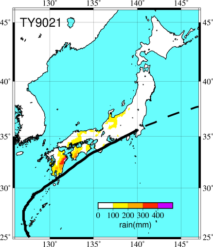 気象の状況9月30日にサイパン島の東海上で発生し、5〜6日には最盛期となって大型・強い勢力を保って沖縄本島付近を通過した。7日から8日にかけ勢力を弱めながら大隈海峡を通って、8日に中型・並みの勢力で和歌山県田辺市付近へ上陸した。いったん海上に抜け、愛知県蒲郡市付近に再上陸し、東海・関東地方を通過して東海上へ進んだ。死者・行方不明4人、負傷者25人、全壊・流失8棟、半壊・一部破損87棟、床上浸水192棟、床下浸水1465棟(情報元:気象要覧第1094号)。 |
