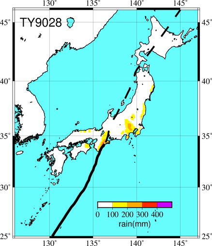 気象の状況11月21日にグアム島の南の海上で発生し、29日に沖縄の南東海上を通過、30日に大型・並みの強さで和歌山県白浜町の南に上陸した。上陸後に温帯低気圧に変わり日本海へ出た。死者・行方不明4人、負傷者12人、全壊・流失1棟、半壊・一部破損161棟、床上浸水156棟、床下浸水1388棟(情報元:気象要覧第1096号)。 |