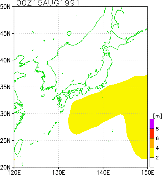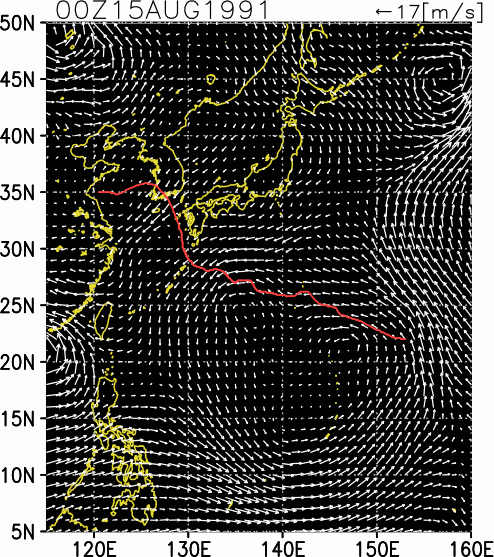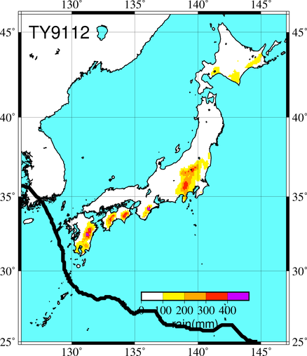 気象の状況8月15日に南鳥島の南西海上で発生し、21日から22日にかけて九州の南海上で最も発達し、大型で並の強さとなった。23日に大型で並の強さで福江市付近を通過した後、朝鮮半島南部に上陸した。死者・行方不明16人、負傷者11人、全壊・流失9棟、半壊・一部破損44棟、床上浸水512棟、床下浸水3650棟(情報元:気象要覧第1104号)。 |