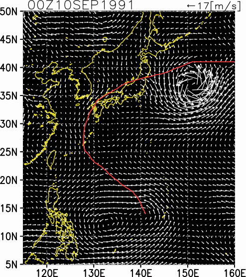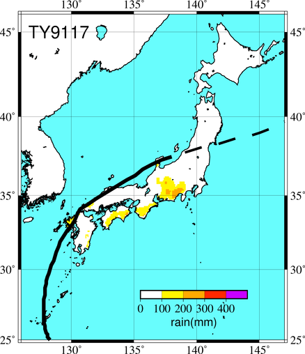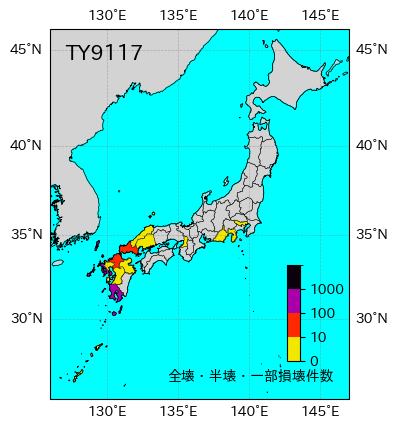 気象の状況9月10日にマリアナ諸島近海で発生し、13日には中型で強い勢力まで発達して沖縄本島を通り北に向きを変え、14日に同じ勢力で長崎市付近に上陸した。その後、急速に勢力を弱めながら北東から東北東に進み、山陰、北陸地方を経て、東北地方で温帯低気圧に変わり、さらに東進した。死者11人、負傷者82人、全壊・流失15棟、半壊・一部破損367棟、床上浸水641棟、床下浸水1945棟(情報元:気象要覧第1105号)。 |