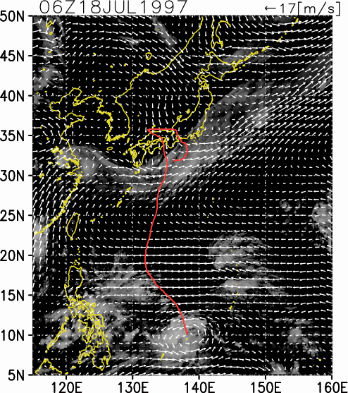 気象の状況7月18日にフィリピンの東海上で発生し、22日には大型で強い勢力となった。25日にこの勢力を保ったまま南大東島の東海上、更に日本の南海上を北上し、26日に中型で強い勢力で徳島県阿南市付近に上陸した。その後、播磨灘を通り、岡山県備前市付近に再上陸し、向きを北西に変えて中国地方を横断、27日には山陰沖にほぼ停滞した。28日に同海域で弱い熱帯低気圧となって東に進み、28日から29日にかけて北陸地方西部から東海地方へ南下して、東海沖へ進んだ。その後西寄りに進み、31日に紀伊半島の南海上で消滅した。死者3人、負傷者47人、全壊8棟、一部破損70棟、床上浸水395棟、床下浸水1662棟(情報元:気象要覧第1175号)。 |