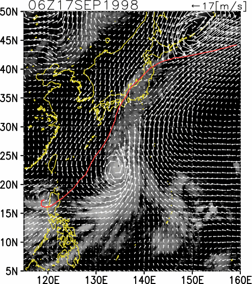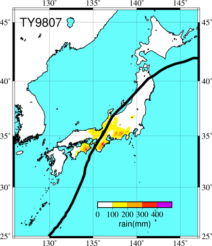 気象の状況9月17日にルソン島の西の海上で発生し、21日には中型で強い勢力となり南大東島の北の海上へ進んだ。台風は暴風域を広げながら、速い速度で西日本の南海上を北東へ進み、22日に和歌山県御坊市付近に上陸した。近畿地方を通って富山湾へ進み、中型でなみの強さの勢力で山形県の鶴岡付近に再上陸した。東北地方を通って23日には北海道の南海上へ進み、北海道の東海上で温帯低気圧に変わった。死者・行方不明18人、負傷者569人、全壊85棟、半壊771棟、一部破損20276棟、床上浸水1565棟、床下浸水7113棟(情報元:気象要覧第1189号 台風第8号の被害を含む)。 |