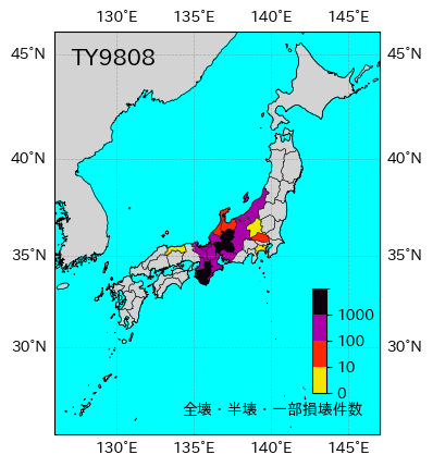 気象の状況9月19日に沖ノ鳥島の北の海上で発生し、紀伊半島の南海上を北上後、21日に小型で弱い勢力で和歌山県の田辺市付近に上陸した。台風は紀伊半島北上し、滋賀県北部で弱い熱帯低気圧になった。その後、富山湾へ進み、北日本付近で消滅した。死者・行方不明18人、負傷者569人、全壊85棟、半壊771棟、一部破損20276棟、床上浸水1565棟、床下浸水7113棟(情報元:気象要覧第1189号 台風第7号の被害を含む)。 |